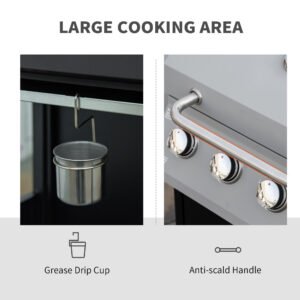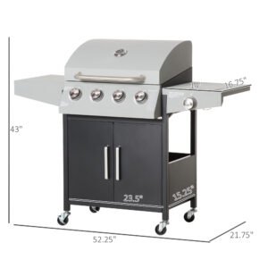 The 4-in-1 gas BBQ grill from [BRAND NAME] features four burners and a side burner, ideal for outdoor barbecue parties. The lid design helps preserve all the flavors. When preparing for your party, you can put all your grilling essentials and accessories within easy reach on the side tabletop. It includes two wheels is quite convenient for you to move it. Add the durable and safe BBQ and enjoy your cooking outdoors with complete peace of mind.