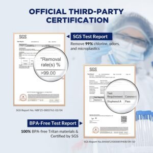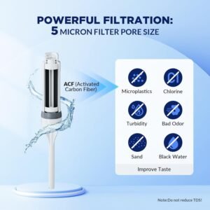 - Superior ACF Filters: The ACF (Activated Carbon Fiber) filters achieve faster flow rates up to 800ml/min and maintaining 99.9% removal efficiency of chlorine, odors, and microplastics. The 4 stages filtration design enhances particulate capture capacity, ensuring smoother water flow with minimal pressure drop.